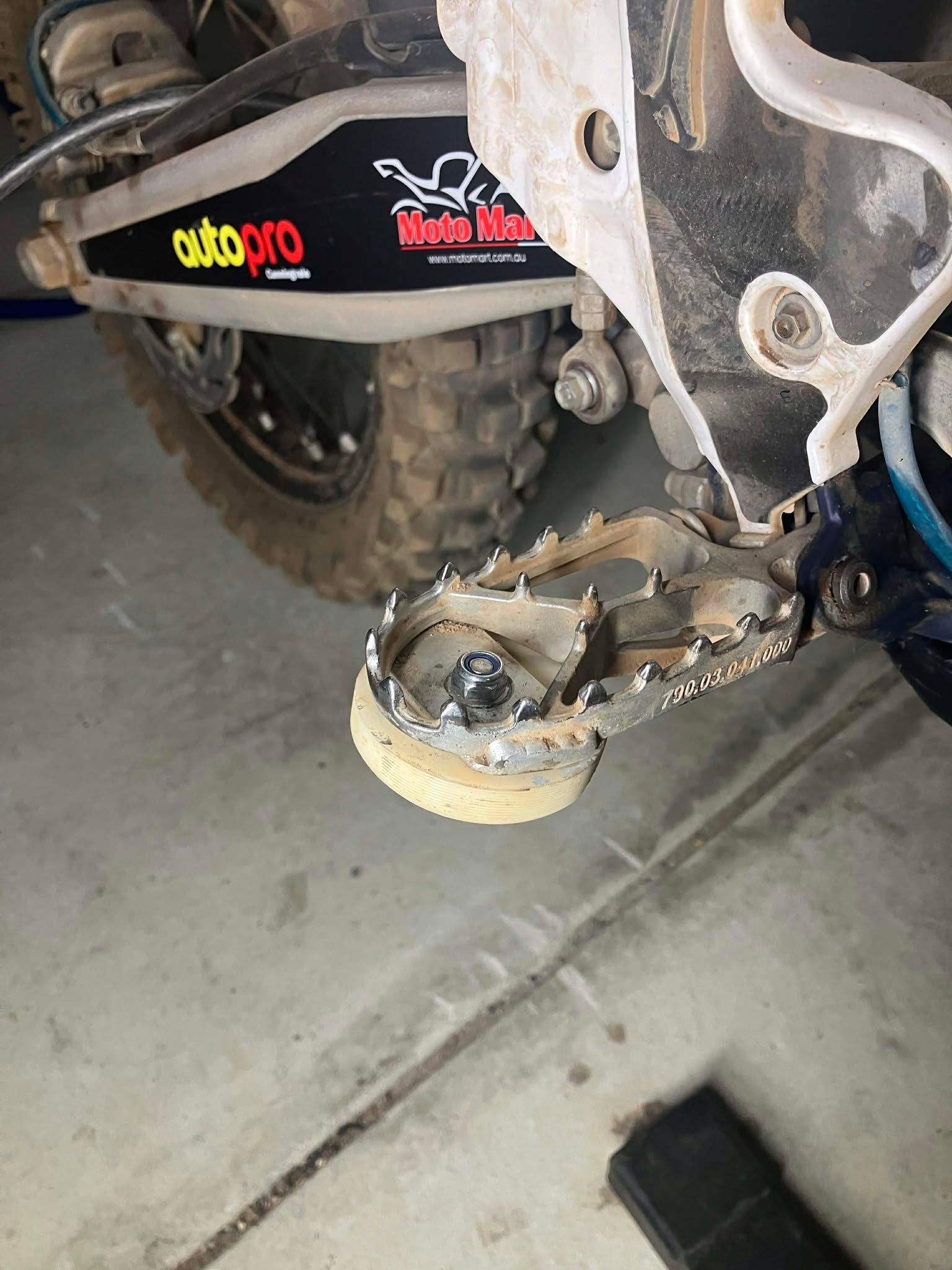 Peg sliders must be fitted to the underside of both foot pegs, be constructed of a non-stick, non-abrasive material and anchorages must be contained within the device to impede contact with the ground.